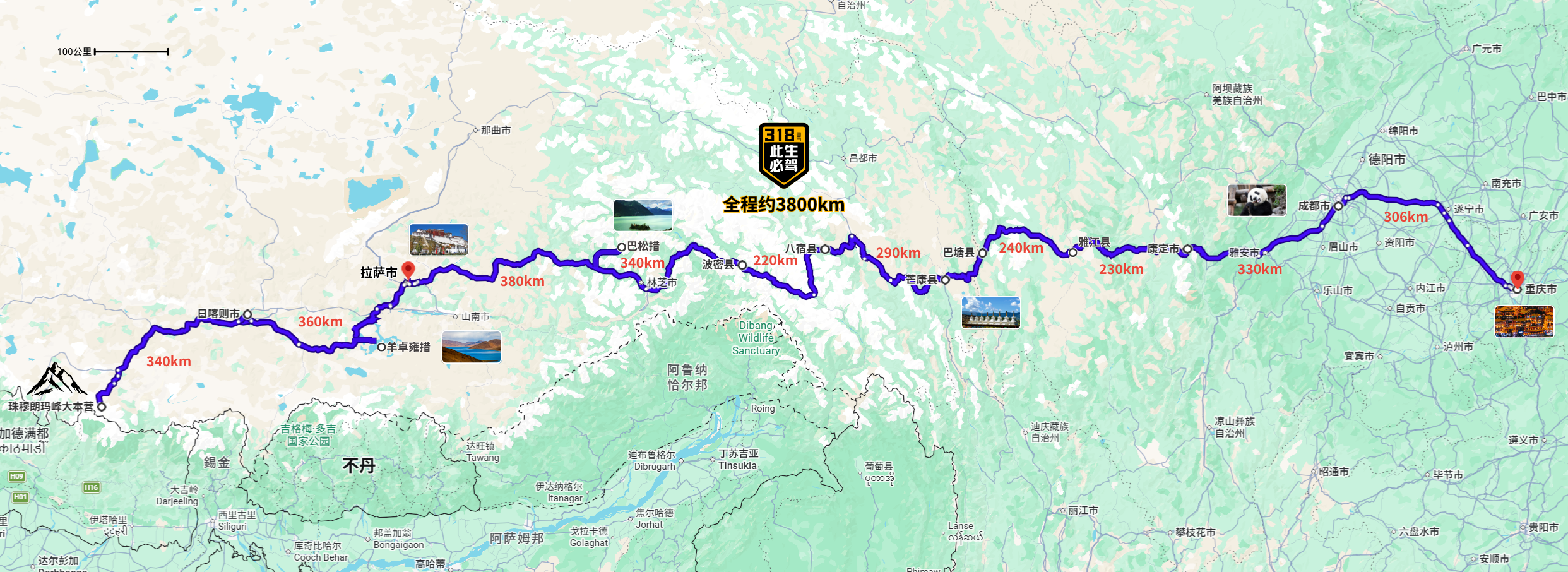 全程约 3,800 公里,从重庆出发,沿川藏南线(G318)深入西藏腹地,抵达拉萨后继续前往珠峰大本营,再沿雅鲁藏布江河谷返回拉萨。