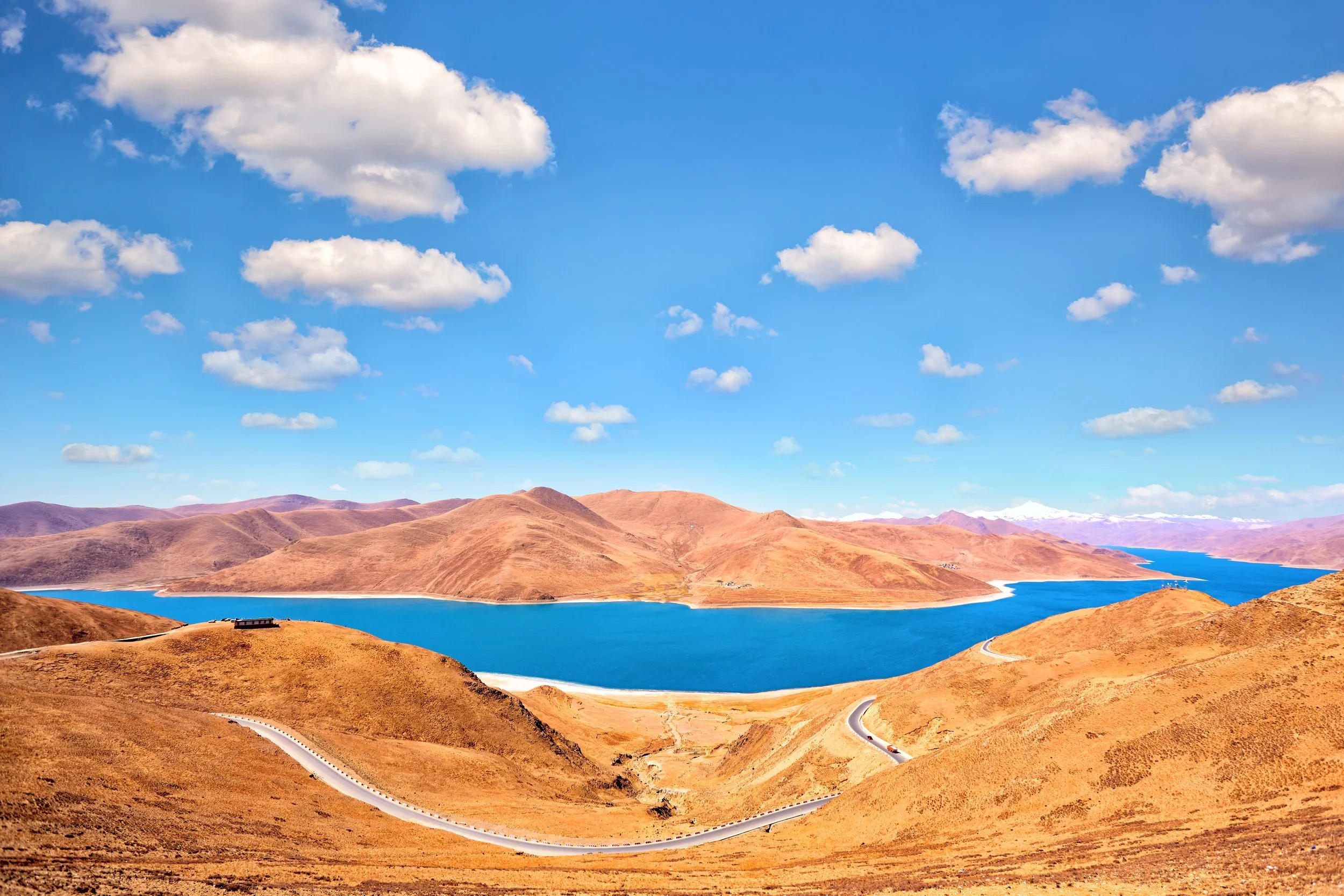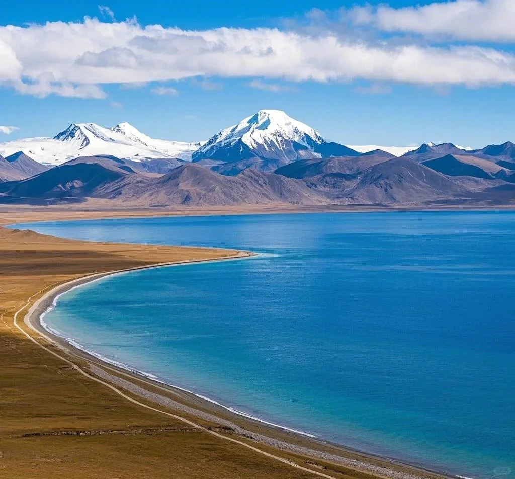 沿途经过深蓝的佩枯措,远处是中国海拔8000米级雪峰的唯一一个全境——希夏邦马峰。